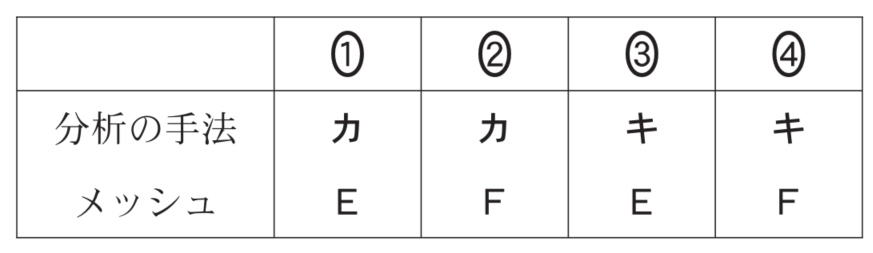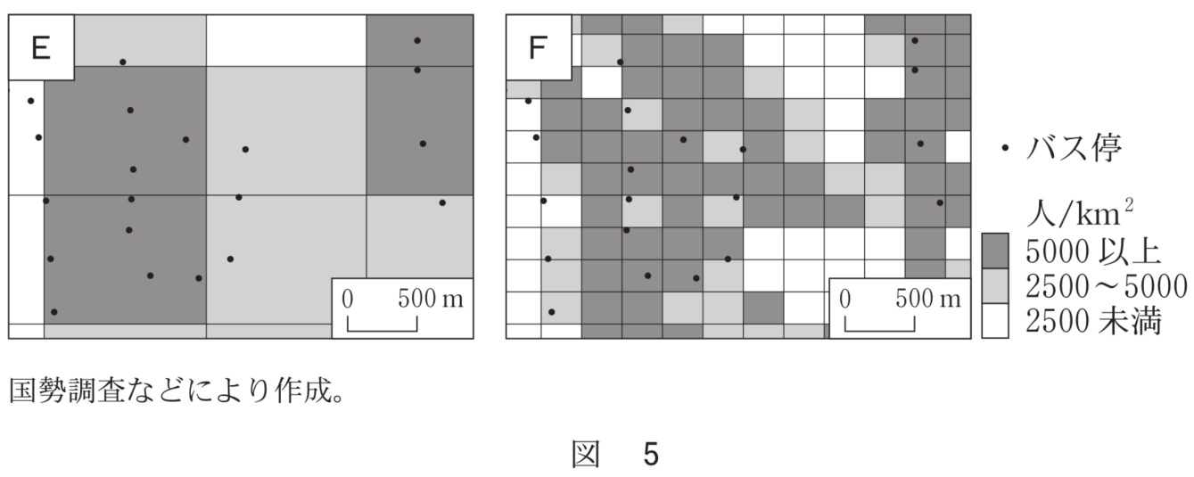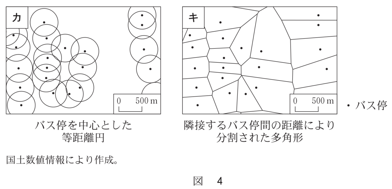 次の図4は、ある地域のバス停の分布を示したものであり、カとキは、異なる空間分析の手法を示したものである。また、後の図5は、図4と同じ範囲のバス停の分布と人口密度の分布を重ねて示したものであり、EとFは、人口密度を異なる大きさのメッシュで示したものである。バス停から300m以上離れた地域に住む人口を、GISを用いて高い精度で推計するための分析の手法とメッシュとの組合せとして最も適当なものを、後の①~④のうちから一つ選べ。[ 3 ]