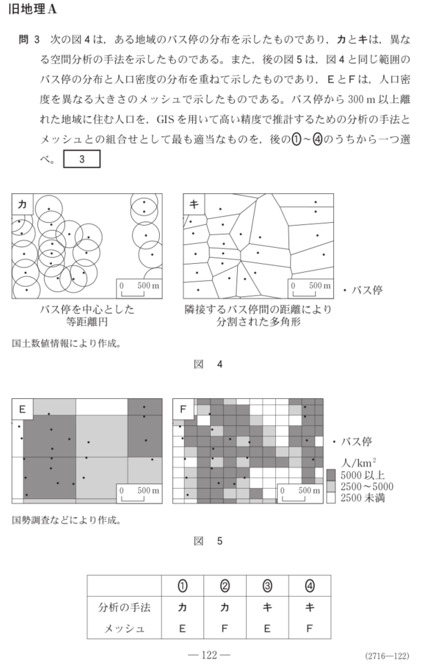 다음 '그림 4'는 한 지역의 버스 정류장 분포를 보여 주며, 'カ'와 'キ' 는 다른 공간 분석 기술을 보여줍니다. 또한, '그림 5'는 '그림 4'와 동일한 범위의 버스 정류장의 분포와 인구 밀도의 분포를 겹쳐서 나타낸 것이며, E와 F는, 인구 밀도를 다른 크기의 메쉬로 나타낸 것이다. 버스 정류장에서 300m 이상 떨어진 지역에 사는 인구를, GIS를 이용해 높은 정밀도로 추계하기 위한 분석의 수법과 메쉬와의 조합으로서 가장 적당한 것을, 후의 ①~④중에서 하나 선택해 주세요. [ 3 ]